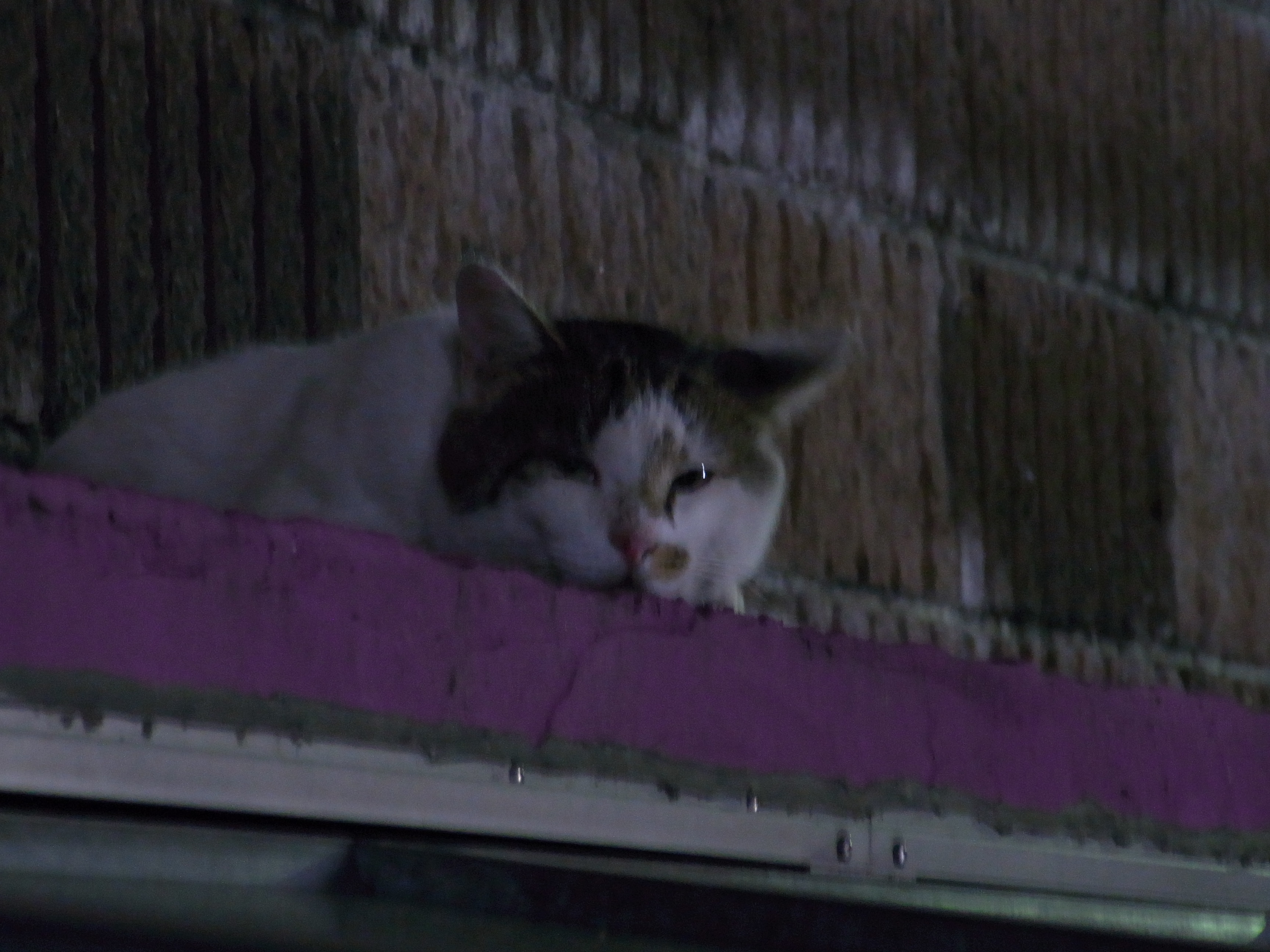 猫は家のすぐ側で。フラッシュ無し、露出+2.0で。撮ってみた。「なにやってるん?」て顔でこっちみてた。