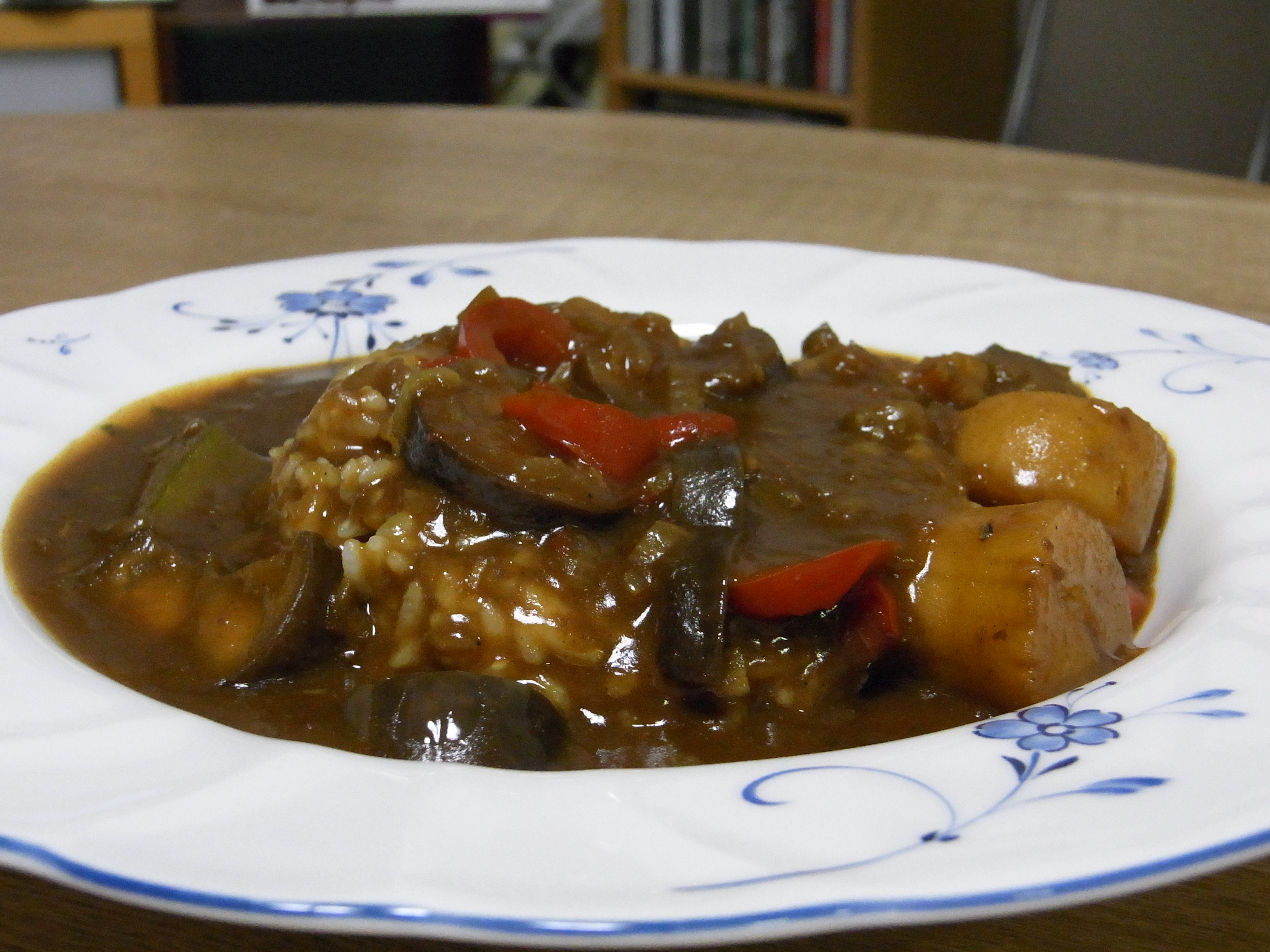 市販のルーを二種類買って混ぜてみたり、ガラムマサラを混入させたホタテ/小エビ/茄子/パブリカ/タマネギ/オクラの具沢山カレーを作ったのだが、それをとってみた。カレーはルーを混ぜたりガラムマサラを混入させたからか大変美味。辛すぎないのが良いな。次はグリーンカレーのペースとかってきて作ろう。